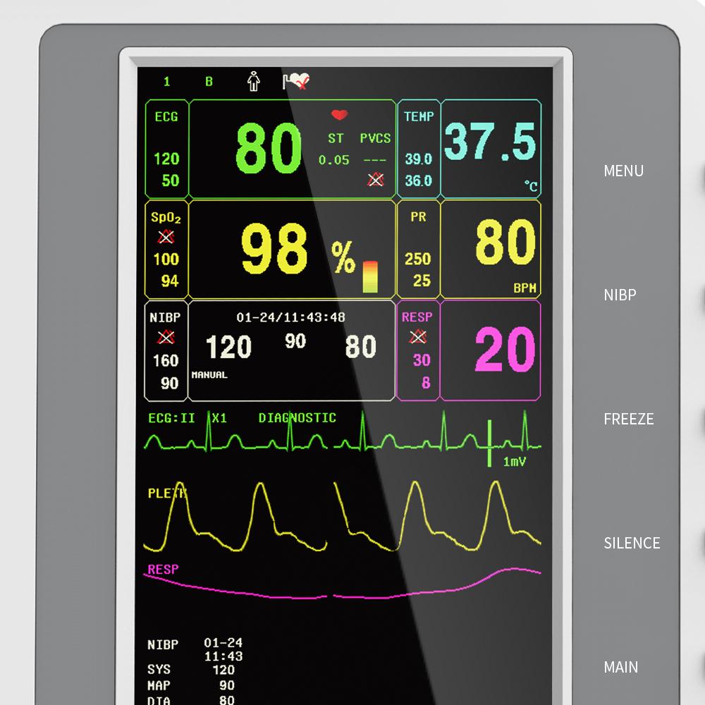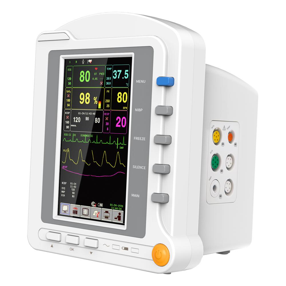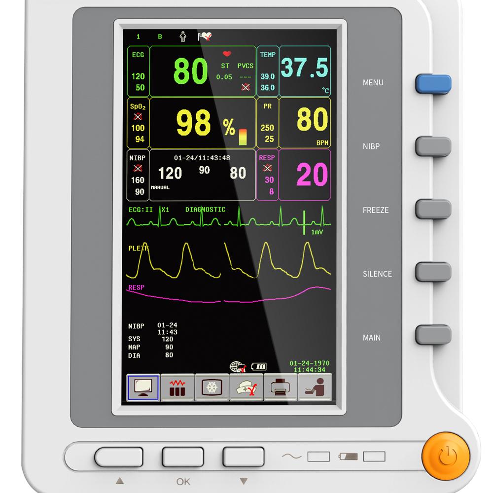 This machine can monitor such parameters as ECG, RESP, SpO2, PR, NIBP and TEMP, etc. It integrates parameter measurement module, display and recorder in one device to form a compact and portable equipment.