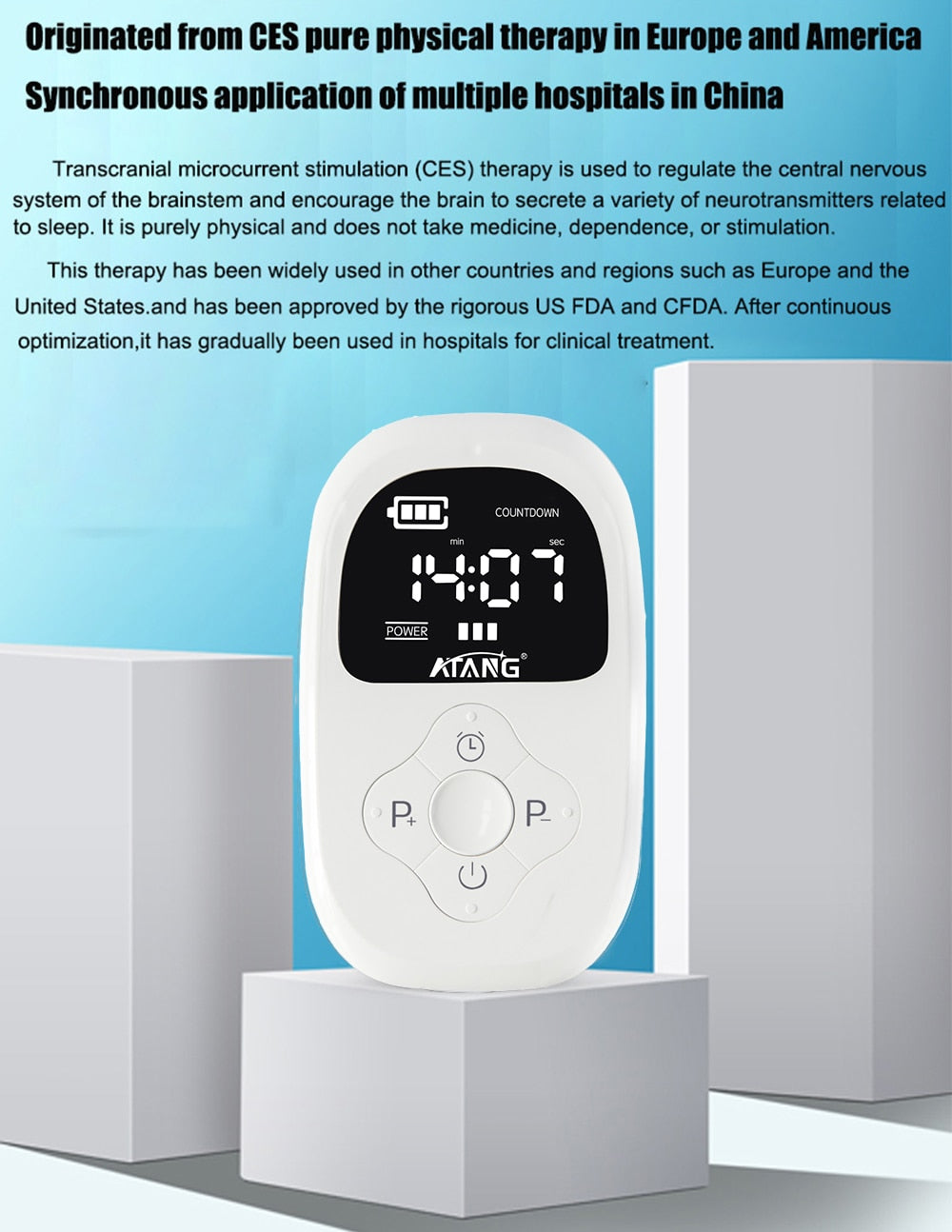 The method and process of the CES therapeutic device is different from the drug,A specially designed current signal is transmitted through the ear clip electrode to the brain for action.