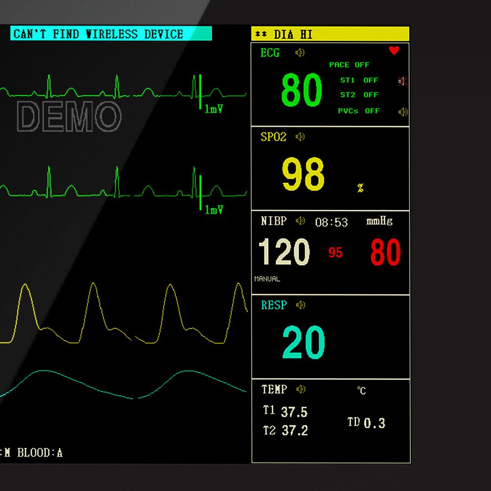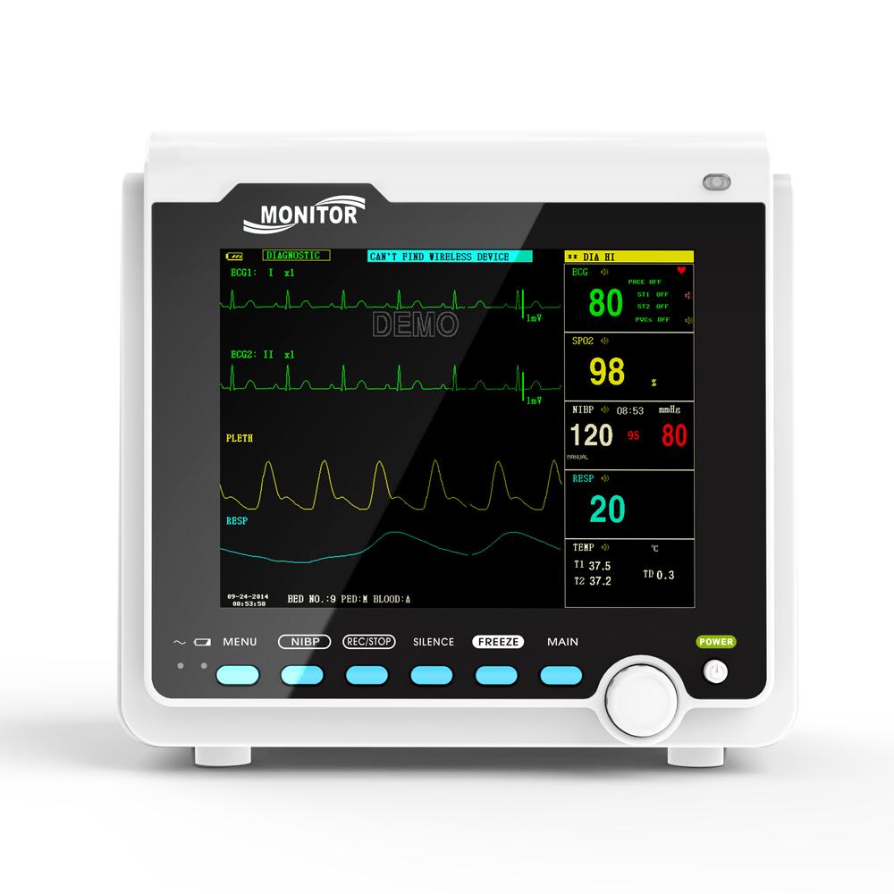 Portable Multi-parameter Patient Monitor is adaptable to adult, pediatric and neonatal usage.This device can monitor such parameters as ECG, RESP, SpO2, PR, NIBP and dual- channel TEMP, etc.It displays real-time data and waveform by 8'' TFT color LCD, and up to 8-channel waveform and all monitoring parameters can be displayed simultaneously.At the same time, its built-in replaceable battery provides convenience for patient moving.